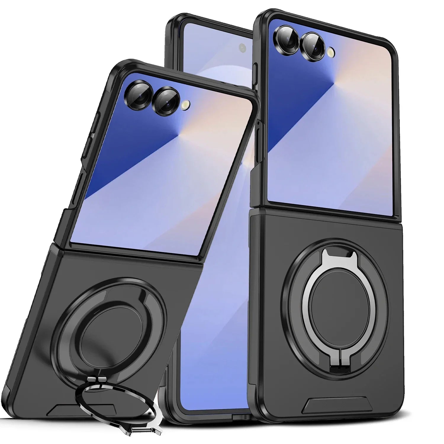 Keep your Galaxy Z Flip 7 safe and functional with this rugged magnetic case. Featuring reinforced corners and raised bezels for superior drop protection, it also includes a built-in 360° rotating ring stand for easy hands-free viewing and secure grip. The strong magnetic back is compatible with car mounts and wireless charging setups.